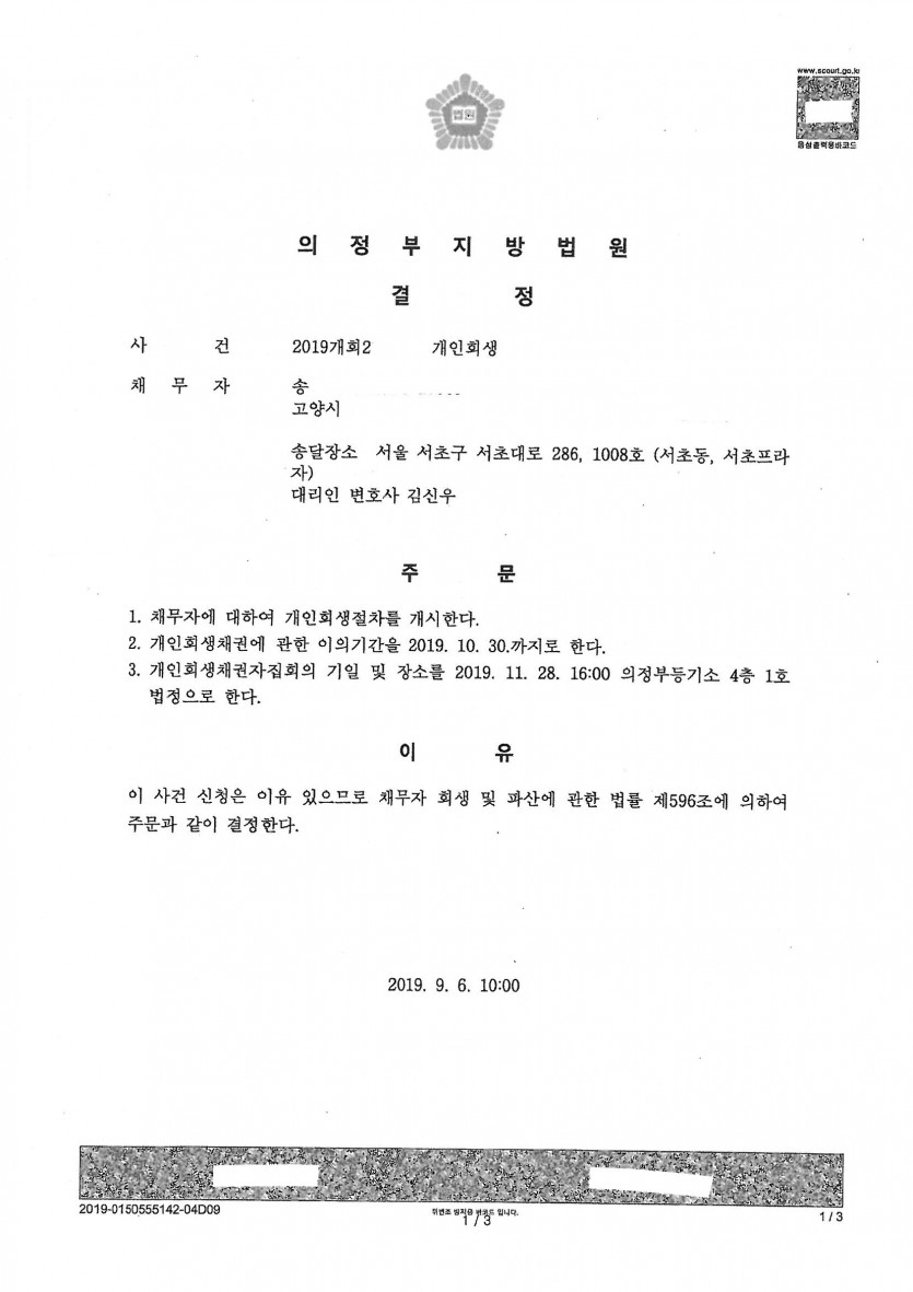 [개인회생] 사업실패와 교육비등으로 인한 채무 85% 탕감