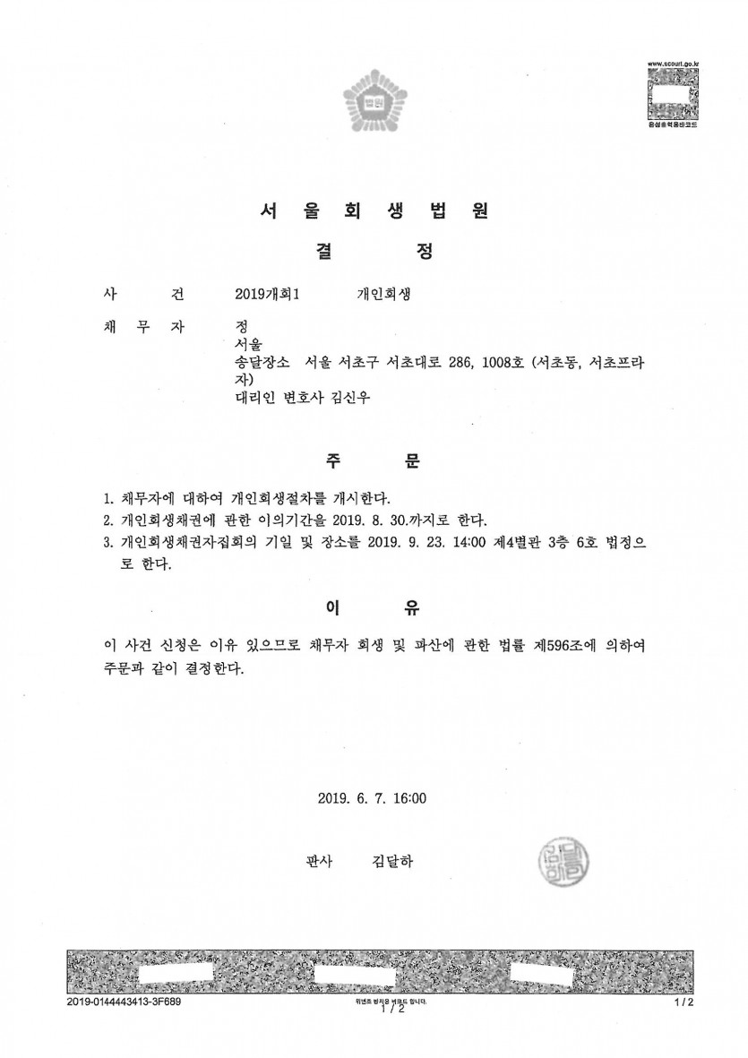 ***월세 중 일부금을 추가생계비로 인정받았으며, 16%의 낮은 변제율로 개시결정이 된 사례입니다.