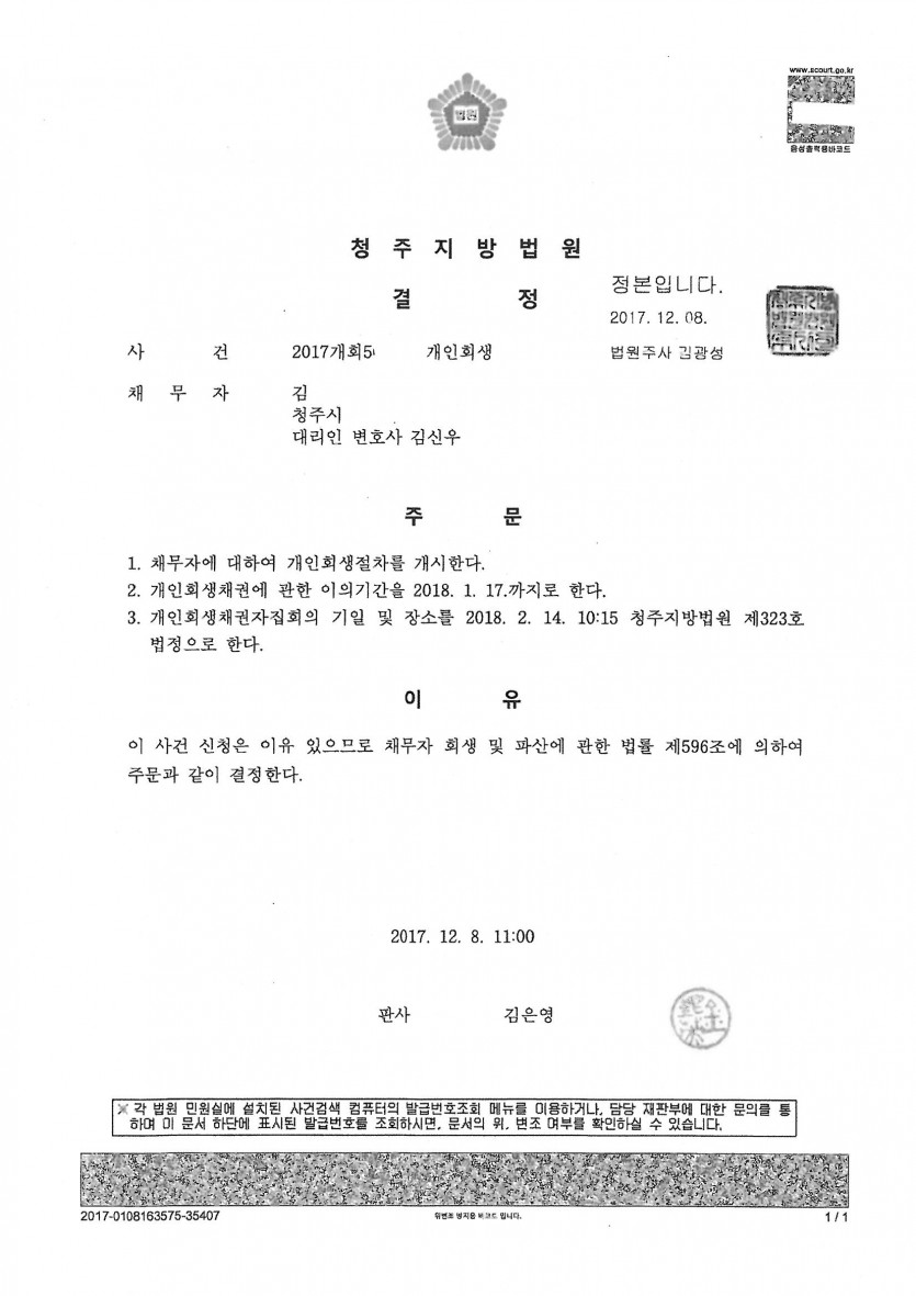 ***개인채권자들도 많고 이의신청도 있어 개시결정까지 다소 기일이 소요되었으나, 36개월 동안 변제하고 원금변제 6%의 낮은 변제율로 개시결정이 된 사례입니다.