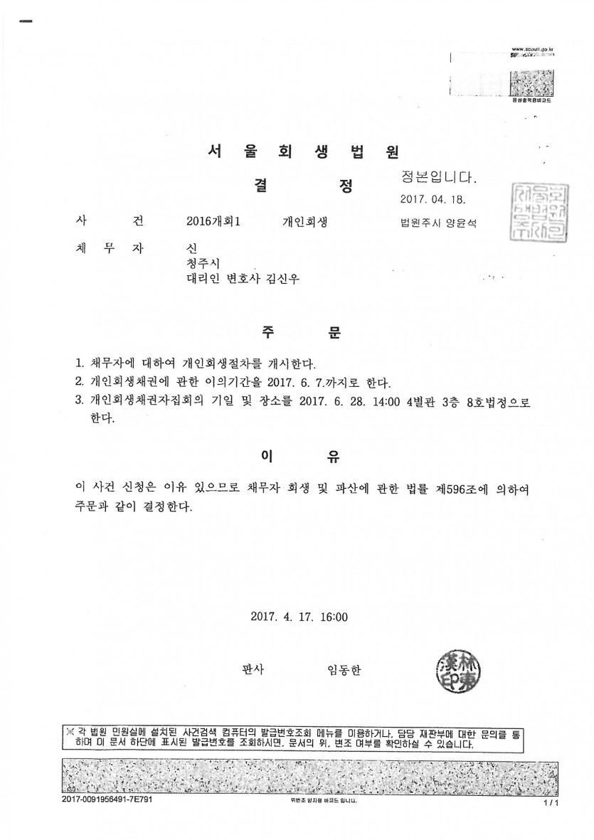 ***개인사채업자가 많아 주소를 알 수 없어 사실조회등으로 주소를 파악한 후 공시송달등으로 송달이 되어 개시결정까지 시일이 많이 소요되었으며, 소명자료가 분명하지 않았지만 채권자로 인정받았고, 13%의 낮은 변제율로 개시결정이 된 사례입니다.