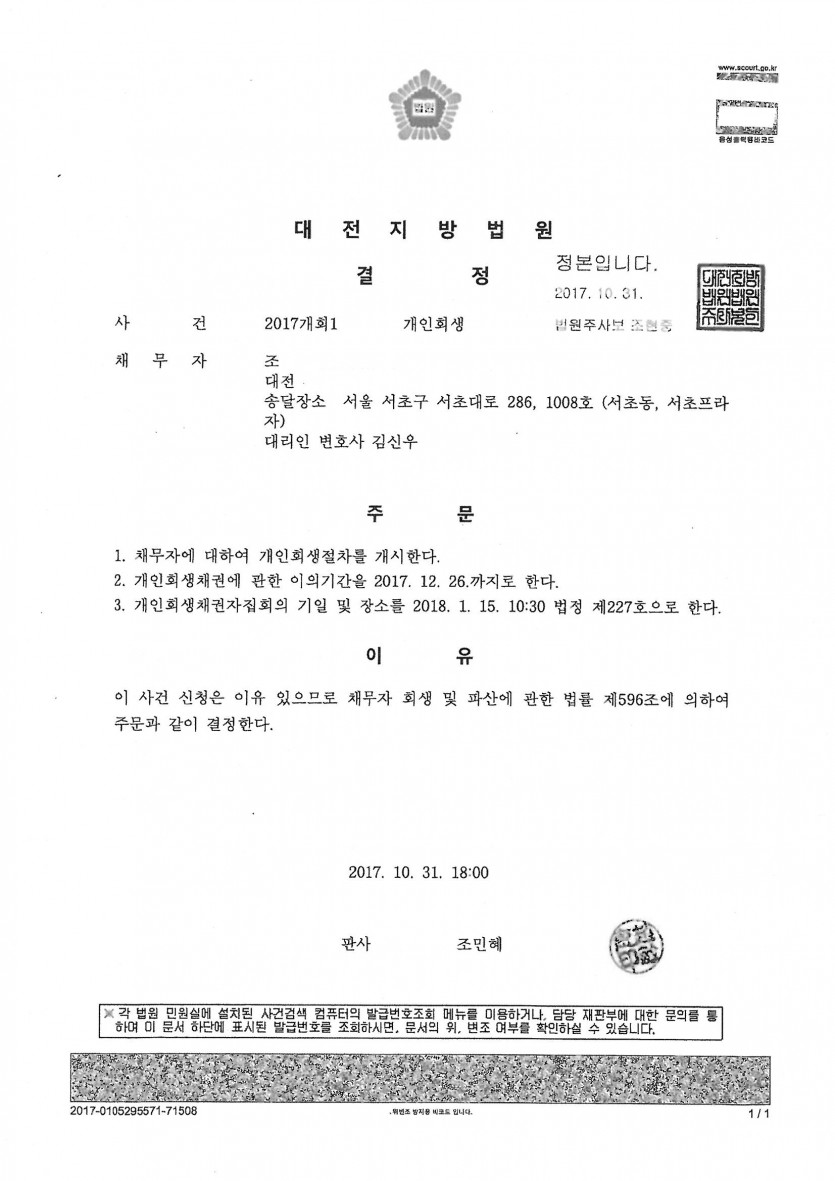 2. 접수 법원: 대전지방법원