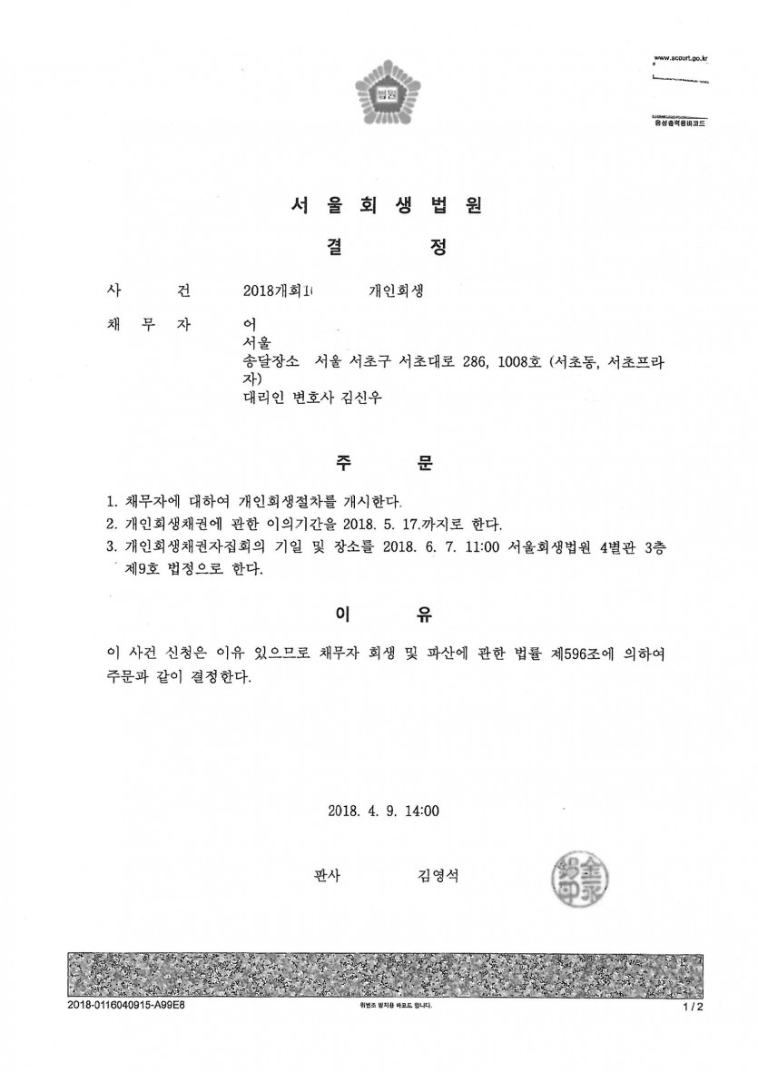 ***신청 후 개시결정까지 1개월도 채 걸리지 않았고, 보정없이 바로 개시결정된 사례로 변제율도 낮으며 최단시간으로 개시결정된 사건입니다.