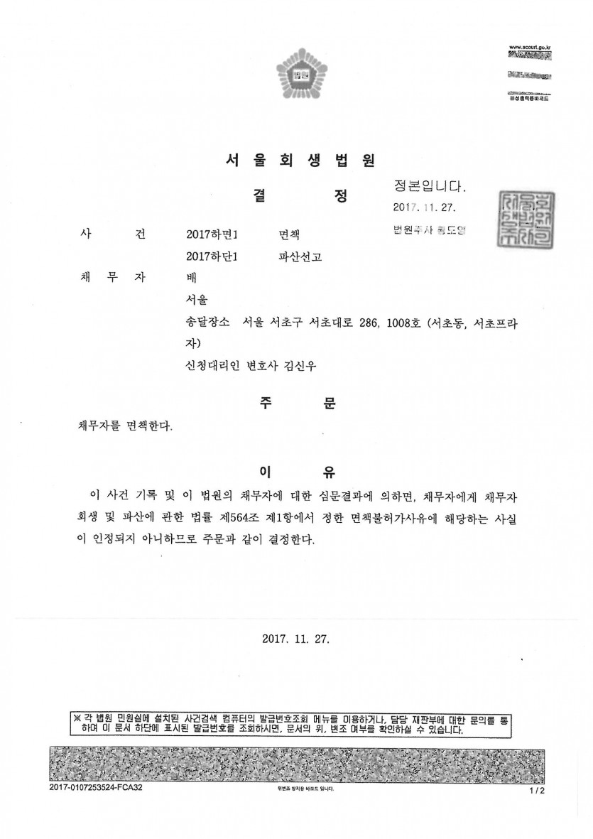***교회의 유사수신행위로 인하여 부부가 같이 개인회생과 개인파산을 진행하였으며, 각각 인가결정과 면책결정을 받았습니다.