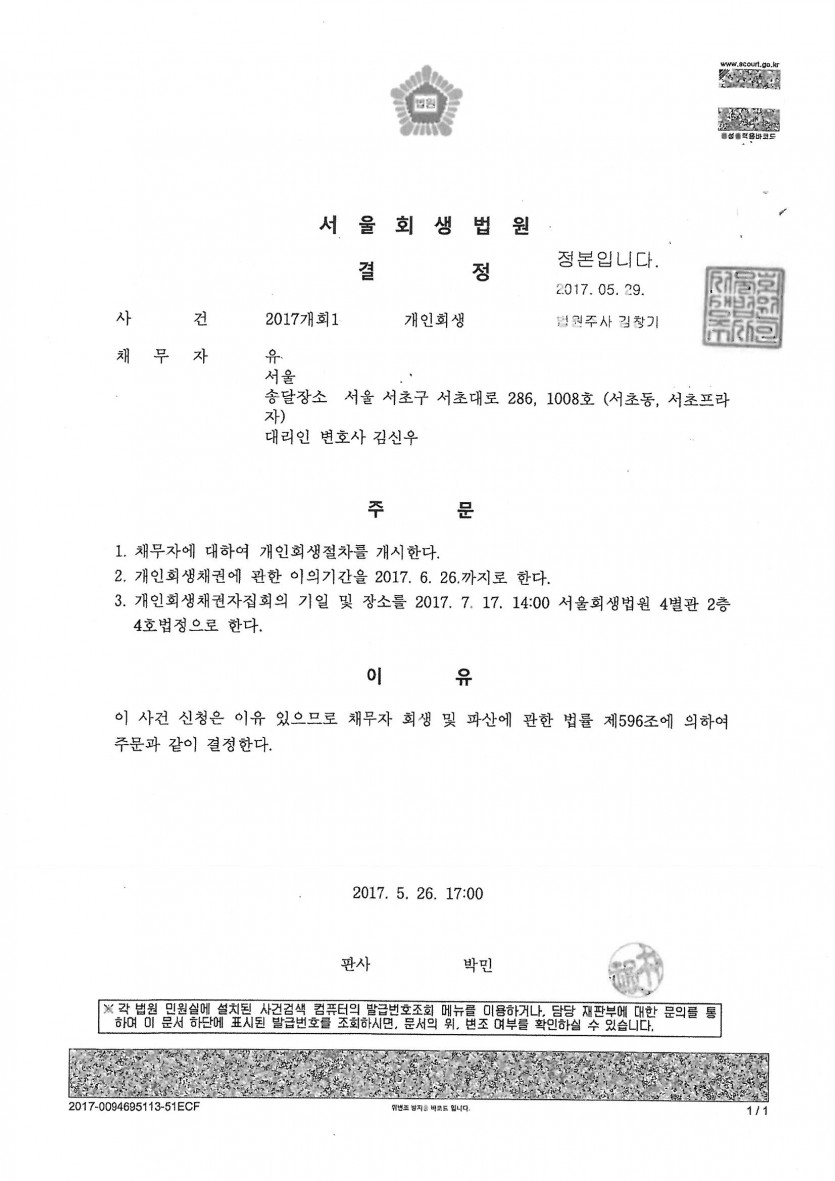 ***외부회생위원에 선임되었으나 별다른 보정없이 개시결정이 되었으며, 자녀 1명을 부양가족으로 인정받았고 개인채권자가 많았으나 송달이 잘 되어 30%의 낮은 변제율로 개시결정이 된 사례입니다.