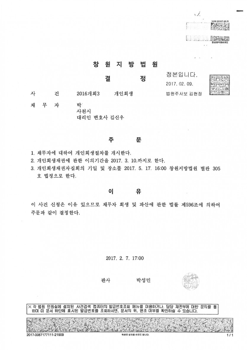 ***최근채무이고 도박채무이다 보니 법원에서 원금 100%로 변제로 보정이 나왔으나 회생위원과 직접 통화하여 변제율 80%로 개시결정이 된 사례입니다.