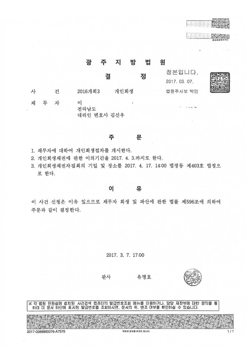 ***보증채무이외에는 다른 채무가 없으며, 보증이 왜 일어났는지, 주채무자가 변제할 수 없는 사유등에 대한 보정이 있었으며, 일용직의 일정하지 않은 수입으로 개시결정이 된 사례입니다.