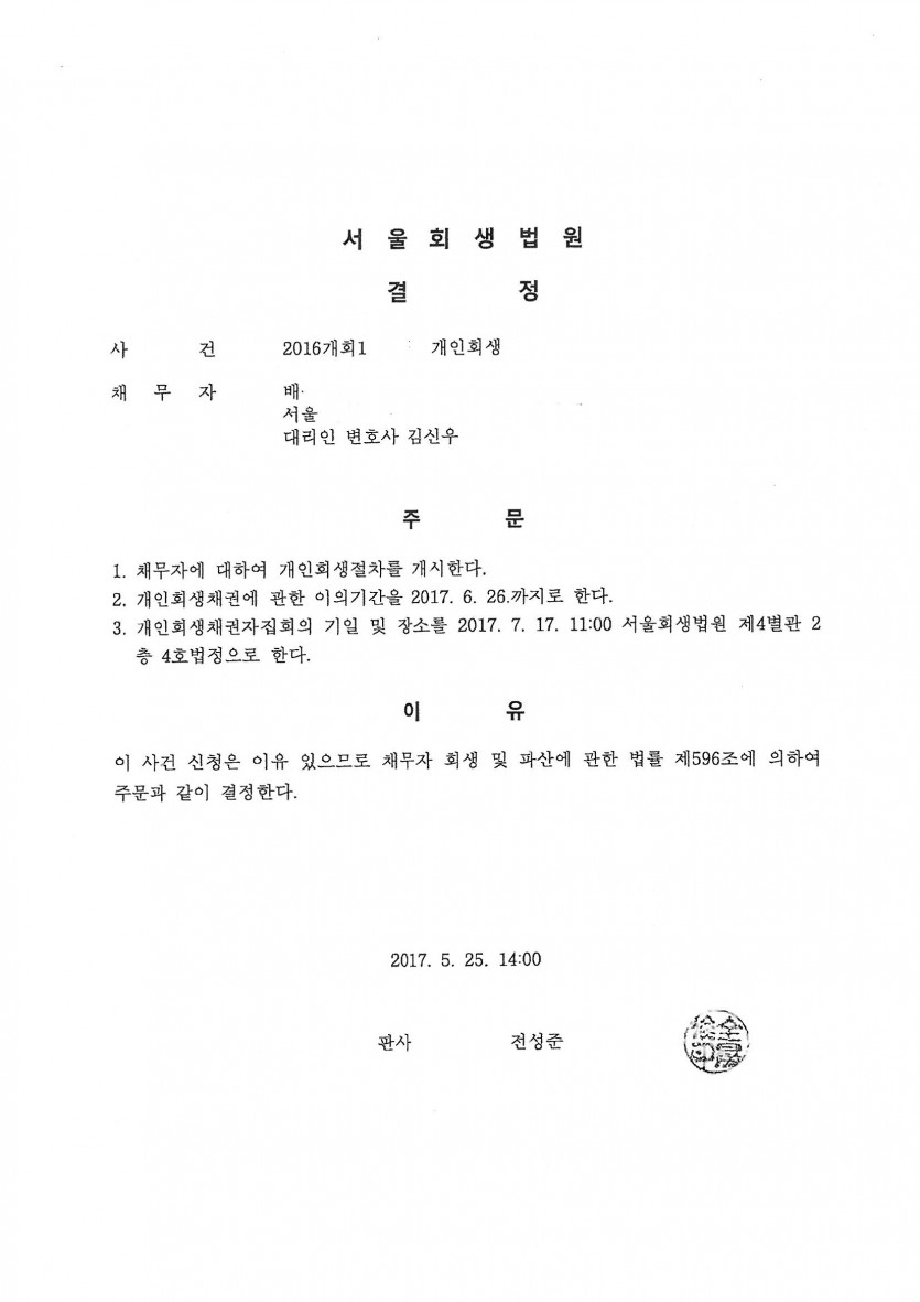 ***학습지교사로 외부회생위원이 선임되었으며, 별다른 보정없이 10%의 낮은 변제율로 개시결정이 된 사례입니다.
