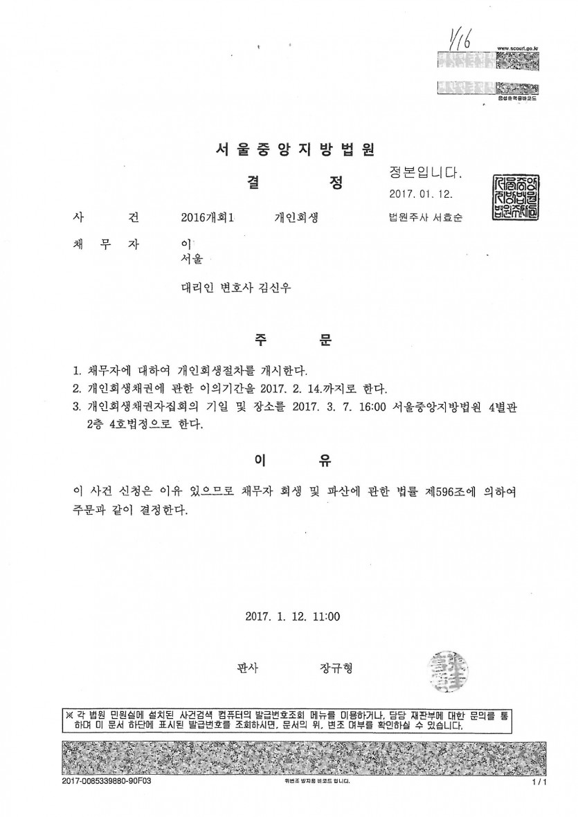 2. 접수 법원: 서울회생법원